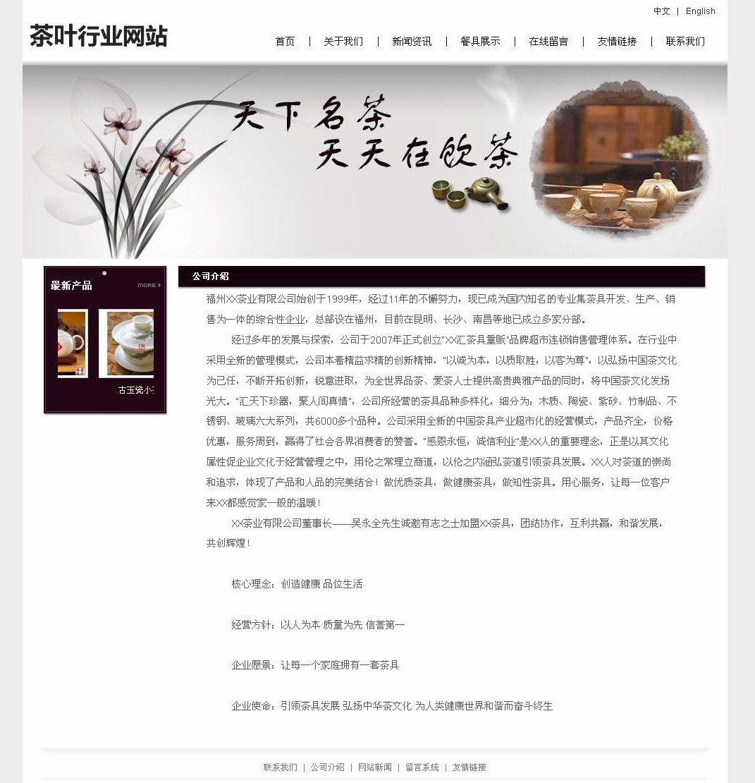 經(jīng) 過多年的發(fā)展與探索,公司于2007年正式創(chuàng)立“XX匯茶具量販”品牌超市連鎖銷售管理體系。在行業(yè)中采用全新的管理模式,公司本著精益求精的創(chuàng)新精神, “以誠為本,以質(zhì)取勝,以客為尊”,以弘揚中國茶文化為己任,不斷開拓創(chuàng)新,銳意進取,為全世界品茶、愛茶人士提供高貴典雅產(chǎn)品的同時,將中國茶文化發(fā)揚 光大。“匯天下珍器,聚人間真情”,公司所經(jīng)營的茶具品種多樣化,細分為:木質(zhì)、陶瓷、紫砂、竹制品、不銹鋼、玻璃六大系列,共6000多個品種。公司采 用全新的中國茶具產(chǎn)業(yè)超市化的經(jīng)營模式,產(chǎn)品齊全,價格優(yōu)惠,服務周到,贏得了社會各界消費者的贊譽。“感恩永恒,誠信利業(yè)”是XX人的重要理念,正是以 其文化屬性促企業(yè)文化于經(jīng)營管理之中,用倫之常理立商道,以倫之內(nèi)涵弘茶道引領(lǐng)茶具發(fā)展。XX人對茶道的崇尚和追求,體現(xiàn)了產(chǎn)品和人品的完美結(jié)合!做優(yōu)質(zhì) 茶具,做健康茶具,做知性茶具。用心服務,讓每一位客戶來XX都感覺家一般的溫暖!