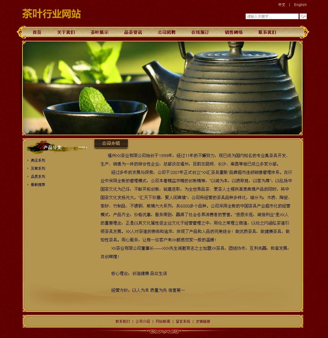 福州XX茶業(yè)有限公司始創(chuàng)于1999年,經(jīng)過(guò)11年的不懈努力,現(xiàn)已成為國(guó)內(nèi)知名的專業(yè)集茶具開(kāi)發(fā)、生產(chǎn)、銷售為一體的綜合性企業(yè),總部設(shè)在福州,目前在昆明、長(zhǎng)沙、南昌等地已成立多家分部。